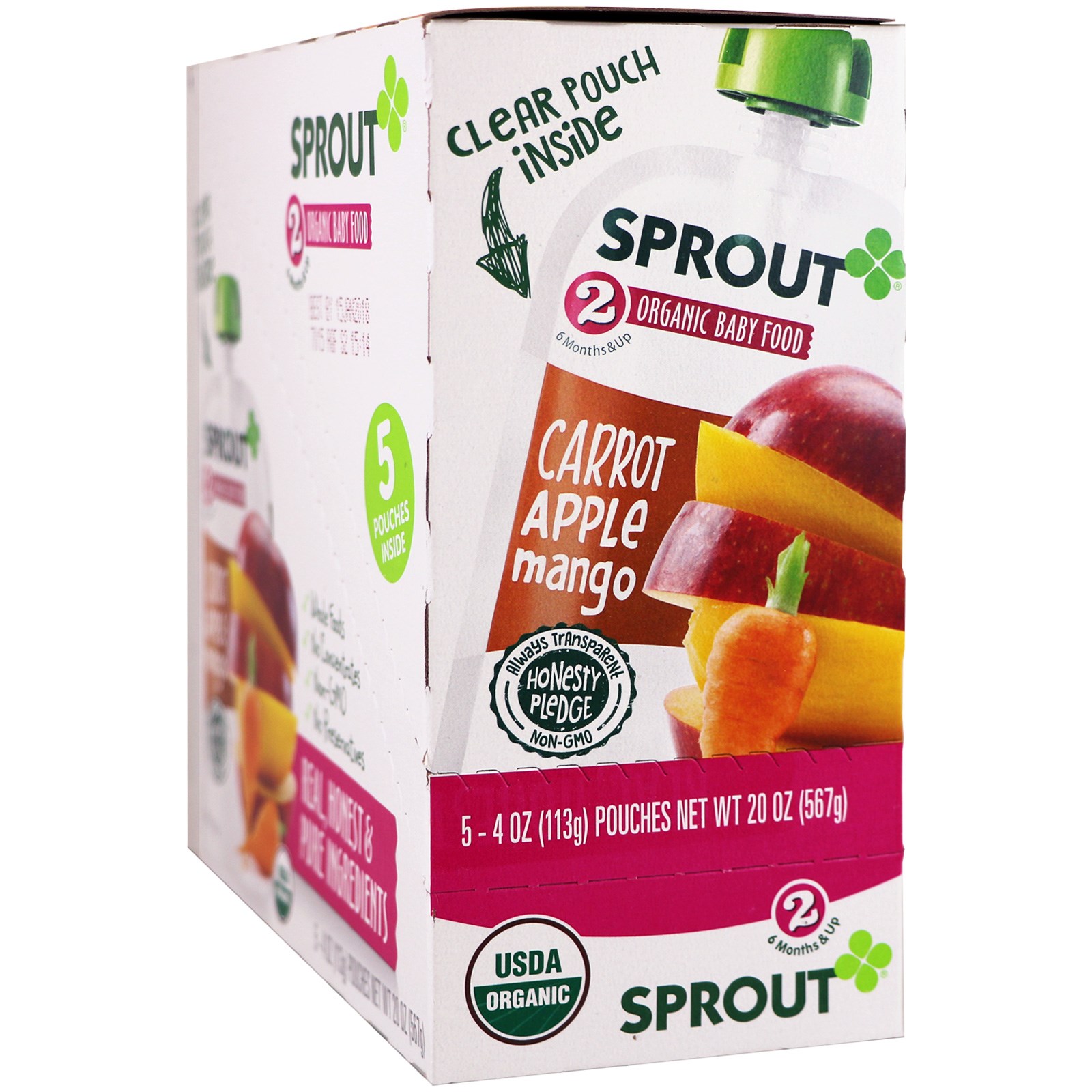 Sprout Organic, Детское питание, этап 2, морковь, яблоко, манго, 5 пакетиков, 4 унции (113 г) каждый