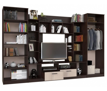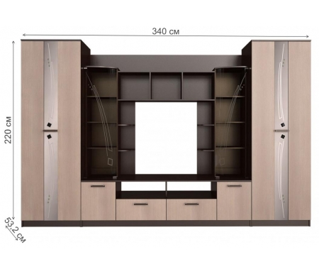 Ширина - 340, см; Глубина - 53,2, см; Высота - 220, см; Размер ниши под ТВ - 120 х 95, см; Площадь комнаты - 16, м2; Вес - 299, кг; Объем - 0,48, м3; Конструкция - готовая; Направление угла размещения - без угла; Цвет - венге / лоредо; Материал каркаса - ЛДСП; Материал фасада - ЛДСП, стекло; Тип поверхности - текстурная; Шкаф - в комплекте; Зеркало - не предусмотрено; Полка - в комплекте; Витрина - в комплекте; Подсветка - не предусмотрена; Стеллаж - не предусмотрен; ТВ-тумба - в комплекте; Страна - Россия; Гарантия - 12, мес;