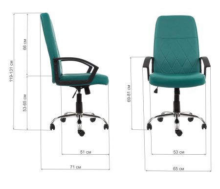 Колесики и подлокотники выполнены из пластика. Ширина кресла - 65, см; Глубина кресла - 71, см; Высота кресла - 119, см; Ширина сиденья - 53, см; Глубина сиденья - 51, см; Высота сиденья - 53, см; Высота сиденья максимальная - 65, см; Высота подлокотников - 69 - 81, см; Цвет - бирюзовый; Материал кресла - искусственная кожа; Материал крестовины - металл; Сиденье - мягкое; Материал колёс - пластик; Наличие подголовника - нет; Наличие подлокотников - да; Наличие колес - да; Максимальная нагрузка на газпатрон - до 100 кг; Поддержка поясницы - нет; Регулировка глубины сиденья - нет; Регулируемая высота - регулируемая высота; Вес - 12,75, кг; Подставка для ног - нет; Механизм качания - да; Тип механизма - топ-ган; Объем - 0,116, куб. м; Гарантия - 12, мес; Страна - Китай;