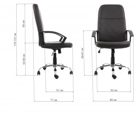 Колесики и подлокотники выполнены из пластика. Ширина кресла - 65, см; Глубина кресла - 71, см; Высота кресла - 119, см; Ширина сиденья - 53, см; Глубина сиденья - 51, см; Высота сиденья - 53, см; Высота сиденья максимальная - 65, см; Высота подлокотников - 69 - 81, см; Цвет - темно-коричневый; Материал кресла - искусственная кожа; Материал крестовины - металл; Сиденье - мягкое; Материал колёс - пластик; Наличие подголовника - нет; Наличие подлокотников - да; Наличие колес - да; Максимальная нагрузка на газпатрон - до 100 кг; Поддержка поясницы - нет; Регулировка глубины сиденья - нет; Регулируемая высота - регулируемая высота; Вес - 12,75, кг; Подставка для ног - нет; Механизм качания - да; Тип механизма - топ-ган; Объем - 0,116, куб. м; Гарантия - 12, мес; Страна - Китай;